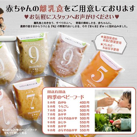 【離乳食のご用意も◎】赤ちゃん連れのご家族利用でも安心の離乳食をご用意しております。気軽にご家族でお楽しみいただけるよう安心の設備で皆様のご来店をお待ちしております♪